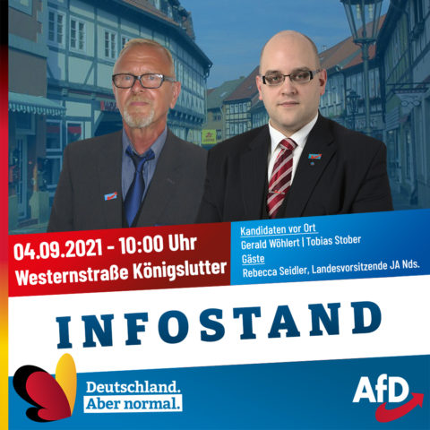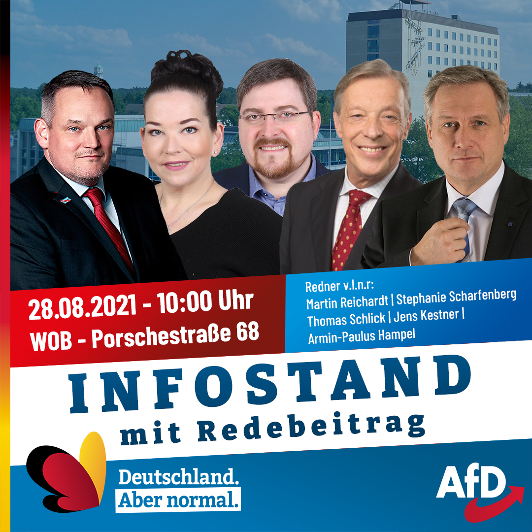 Infostand mit Redebeitrag des AfD Kreisverbandes Wolfsburg am 28.08.2021 von 10:00 Uhr bis 15:00 Uhr in der Porschestrasse 68 / Ecke Drogerie Müller.