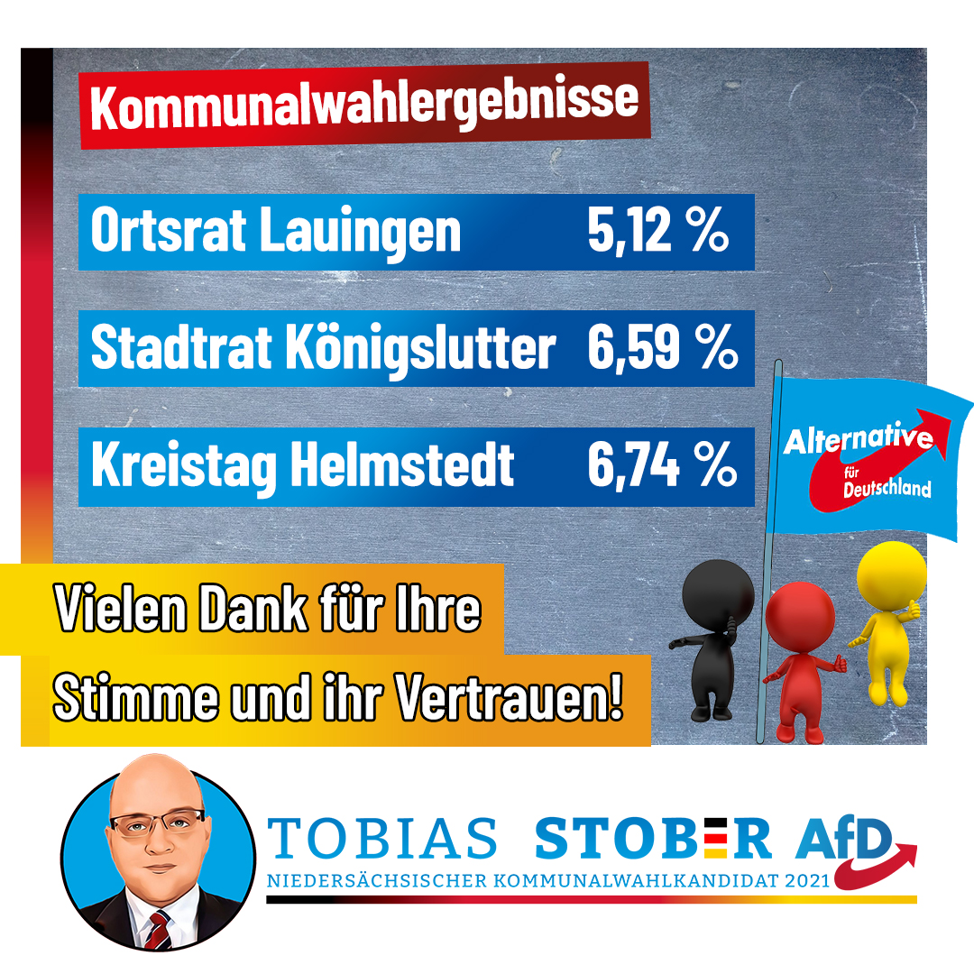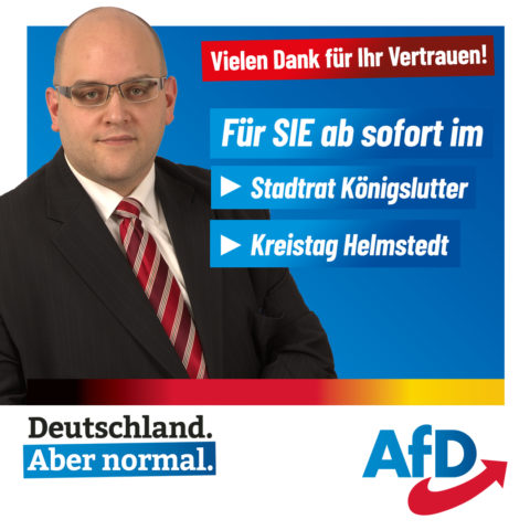 Ebenfalls erfreut bin ich, dass ich die Belange und Interessen meiner Wählerschaft im Kreistag Helmstedt mit meinen Parteikollegen A. Waterkamp und S. Reinhold zukünftig vertreten kann, auch wenn ich mir zeitgleich einen Einzug aller AfD-Kandidaten gewünscht hätte.