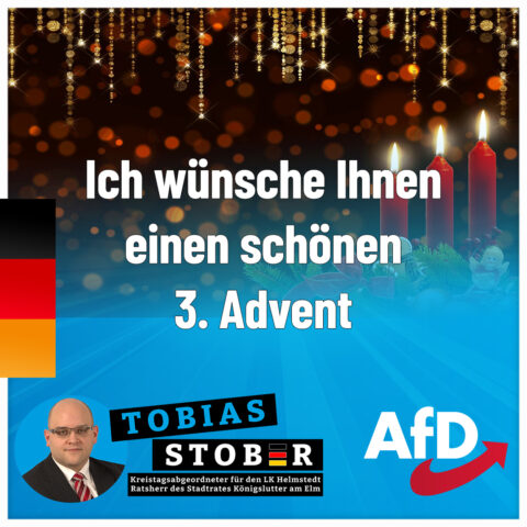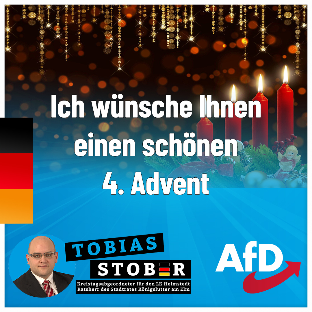 Liebe Freunde, Parteikollegen und Unterstützer der AfD,Ich wünsche Ihnen und Ihrer Familie einen schönen 4.Advent. https://www.tobiasstober.dehttps://www.afd-niedersachsen.dehttps://www.afd.de